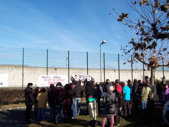 Hier (14/12/2013), à l’appel du mouvement "Herrira", plus de 200 personnes souvent venues du Pays Basque et d’Occitanie se sont rassemblées à la mi-journée devant la prison de Lannemezan ("Lanamesa" - Hautes-Pyrénées). Elles entendaient appeler au respect des droits de l’homme vis-à-vis des prisonniers basques dans les établissements pénitentiaires. Basques et Occitans, à l’occasion de cette manif pour la défense des droits des prisonniers, n’avaient pas oublié Georges Ibrahim Abdallah.
