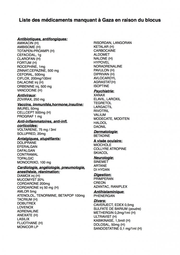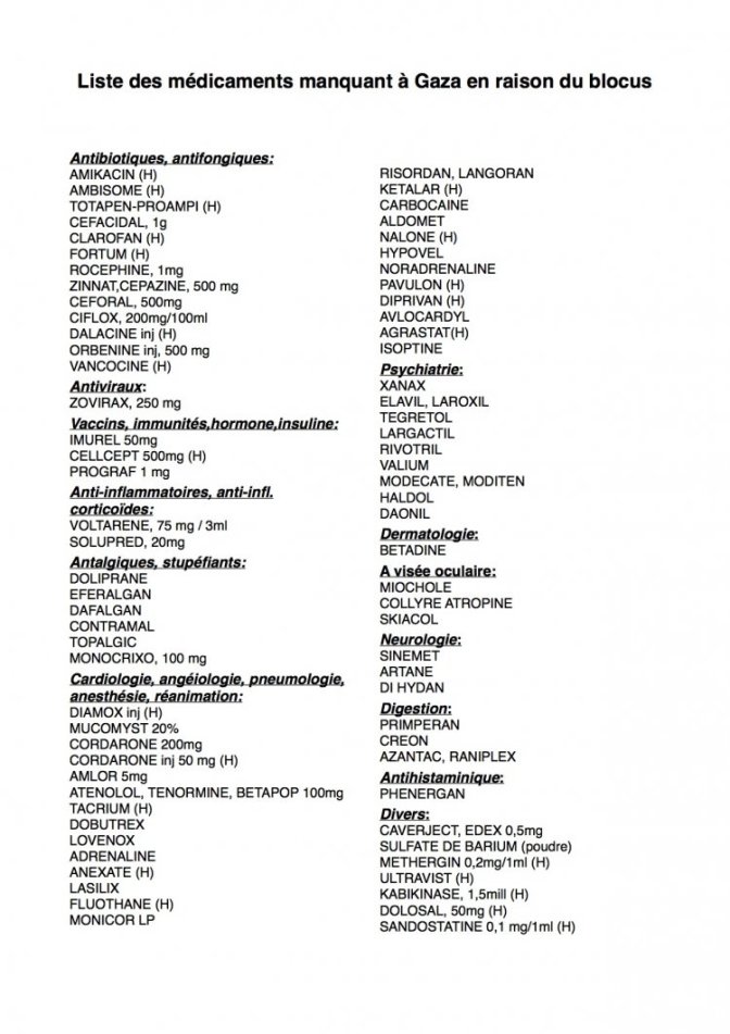 Ci-dessous une liste de médicaments faisant défaut dans la bande de Gaza, en raison du blocus, et transmise par le ministre de la santé de Gaza. Une grande collecte de ces médicaments (neufs et non périmés, bien entendu) sera organisée dans toutes les villes de France le samedi 15 décembre et nous les emporterons à Gaza, à l’occasion de la mission internationale qui s’y rendra fin décembre.