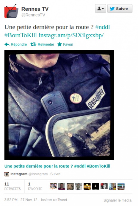 Publie le vendredi 30 novembre 2012 par Camille Polloni - Open-Publishing« Aéroport Notre-Dame-des-Landes : maintenant ça suffit. » Les flics avec eux ? Pas tout à fait.