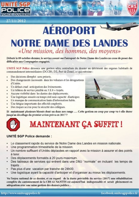 Le syndicat Unité-SGP Police (majoritaire chez les gardiens de la paix) publie un tract sur Facebook pour s’élever contre la désorganisation des opérations policières à Notre-Dame-des-Landes.