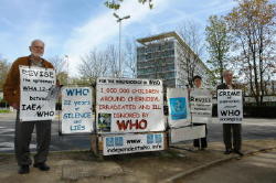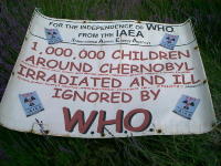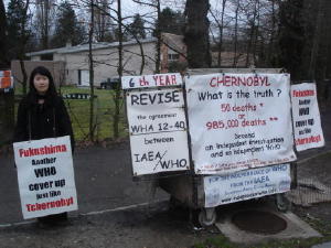 Après un an de vigie devant l’OMS (Organisation Mondiale de la Santé), la commémoration de Genève de l’accident de Tchernobyl a duré une semaine. Le 26 Avril 2008, l’OMS a été ceinturée comme prévu par une chaîne humaine de 300 personnes.