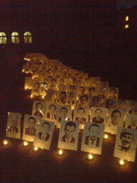 La nuit tombée, l’effet est encore plus impressionnant, il y a une bougie devant chaque photo. Un petit cercle de bougies entoure aussi une femme, la comédienne avec un grand talent met en scène les textes de Svetlana Alexievitch : ELENA. La mémoire passe par les artistes, elle envahie le public et l’histoire reste. On a toujours fait comme cela lorsque les « autorités étaient hostiles ». C’est la population qui se rapproprie l’histoire, elle se réapproprie l’espace public, la mémoire collective. Déjà, cela fait plusieurs années en Bretagne que la veille du 26 Avril, on se réuni pour la cueillette des fleurs.
