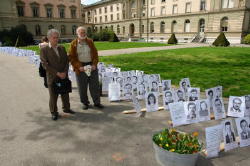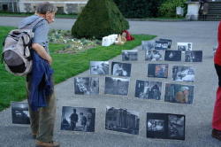 Au parc des Bastions, les autorités ne voulant pas que l’on suspende les 300 photos des liquidateurs (300 parce qu’on n’en avait pas 800000) dans les arbres, cela nous obligea a leur fabriquer la veille, à chacune un support-cadre métallique « de fortune » et finalement, l’impression rendue était encore meilleure, les photos alignées par terre faisaient penser à un cimetière où les passants pouvaient encore mieux mesurer l’ampleur.