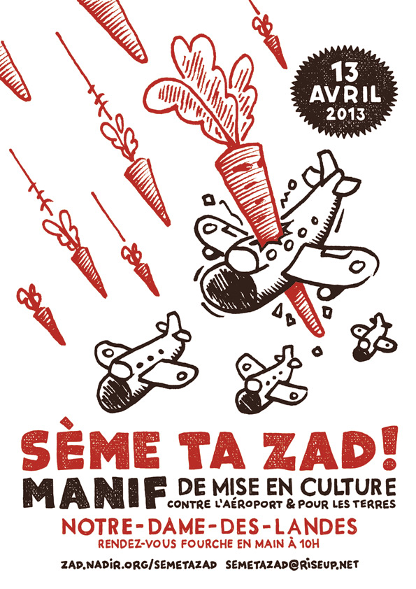 La manifestation "sème ta zad" s’inscrit dans la continuité de la réoccupation du 17 novembre. 6 mois après les expulsions, alors que 19 maisons et cabanes avaient été détruites, plus de 30 nouveaux habitats ont été reconstruits. La zad et la lutte contre l’aéroport, appuyés par plus de 200 comités locaux sont aujourd’hui plus vivant que jamais. A l’heure où la commission du faux dialogue s’apprête à révéler sans nulle surprise son soutien au projet du premier ministre et alors que celui-ci pourrait décider de reprendre les opérations policières, "Sème ta zad !" est une nouvelle étape pour continuer à les mettre en échec. "Sème ta zad !" est une manière de construire ce que sera la zone après l’abandon définitif de la chimère aéroportuaire à Notre Dame des Landes.