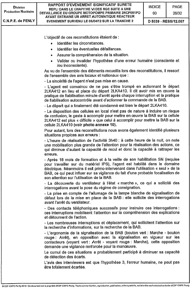 NUCLEAIRE - incident de Penly-Dieppe en avril 2012 : cause humaine privilégiée
