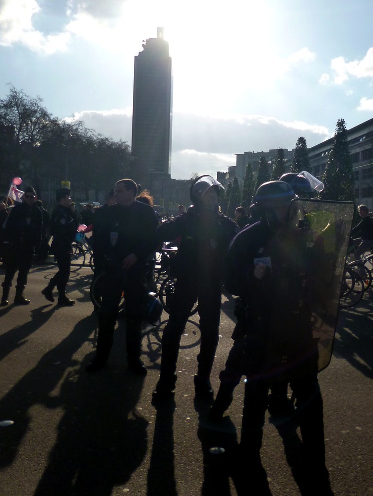 Je marche doucement sur le coté du cortège, avec quelques personnes sur la chaussée, dont une en fauteuil roulant. Une voiture de flics nous colle au cul pour passer, les gens devant moi se retournent, hésitant. Je leur dis à voix basse que nous n’avons cas les ignorer, ils acquiescent après leur avoir jeté un regard de dédain par dessus leur épaule. Un type avec un blouson en cuir qui marchait avec nous depuis un moment vient nous dire de laisser passer la voiture, on comprend que c’est un flic.