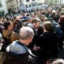 En quelques secondes, deux fourgons de CRS se déchargent de leur vermine, un petit bloc de 6 ou 7 clébards bien énervés, casqués, boucliers en mains, vient au contact afin de protéger le joyeux cortège... Je vois les flics taper dans le tas, une matraque ce lève, et éclate le visage d’une personne, ça gueule, ça pousse les boucliers de plus belle, une dame tombe violemment à terre, deux jets de lacrymo badigeonnent alors le groupe.