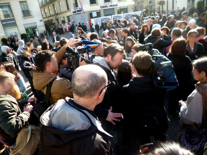 On arrive devant la Préfecture, on passe le rond point pour se regrouper sous la colonne. On forme à présent un arc de cercle face à des amis, parents et sœurs de Djamal. Les larmes précèdent les mots, les mains viennent trouver les épaules voisines, des personnes s’enlacent et toutes les joues autour de moi rougissent et commencent à ruisseler, celles des gosses comme celles des vieilles, militants et moins militants. Une lame de fond monte de mon estomac à mon sternum, du sternum au larinx. Je choisis de ne pas résister et accueille la vague qui me submerge. Je lâche ce déferlement de rage, de tristesse, mes mâchoires se serrent. Mes yeux sont deux rivières. Sentiment d’unité profonde avec le groupe.