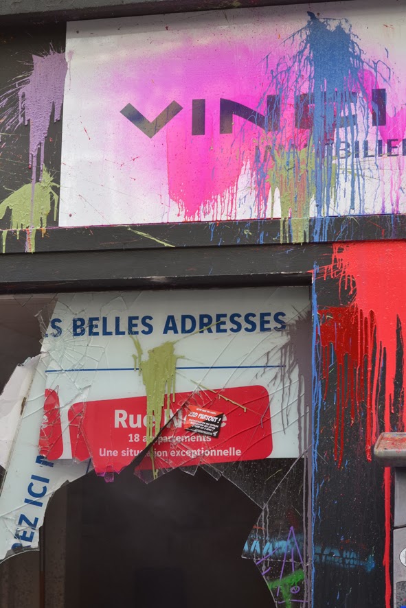 Et il est vrai que sur le parcours, très tôt, une succursale d’EDF est aspergée de peinture. Plus loin une boutique Vinci est aspergée de peinture et sa vitrine est brisée.