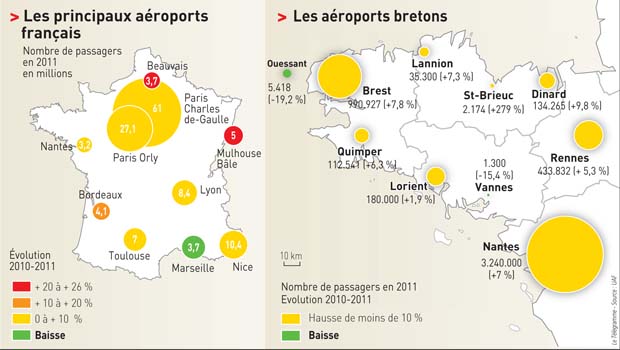 Nantes a toute légitimité à souhaiter un nouvel aéroport. Le survol de la ville et l’exposition au bruit soulèvent des problématiques croissantes, au rythme d’une montée du trafic (3,2millions de passagers), effectuée à marche forcée et parfois au détriment des autres plateformes bretonnes, avec, en bout de ligne, le seuil de la saturation. Mais cette forte croissance se distingue dans un ciel breton aux surcapacités aéroportuaires. Rennes, avec ses 400.000 voyageurs annuels, réalise un trafic à peine supérieur à un dixième de celui de Nantes, bien qu’il n’y ait qu’une heure de route entre les deux équipements. L’aéroport de Saint-Brieuc est pratiquement vide, celui de Lannion (22) souffre, celui de Dinard (35) également, malgré ses ateliers de réparations, ceux de Brest, Quimper ou Lorient ont la capacité de doubler leur trafic actuel sans grande difficulté. Et le futur aéroport viendra encore amputer leur aire commerciale. Dans le domaine aérien, il n’y a, certes, pas de répartition ou de modulation du trafic passagers. Mais dans une période où les financements publics vont connaître un sévère tour de vis, les opposants reposent la question : pourquoi, dans le contexte actuel, mobiliser de telles emprises foncières et des investissements aussi lourds pour un nouvel aéroport alors qu’il y en a plusieurs dans l’Ouest en sous-capacité d’activité ?