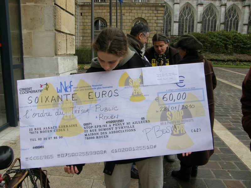 C’est la façon originale choisie par le collectif « Stop EPR, ni à Penly, ni ailleurs » pour régler l’amende que lui a infligé la Ville pour affichage sauvage. « Un autocollant pris au hasard sur un panneau de signalisation qui appelait à une manifestation en juin dernier », explique Alain Correa, l’un des porte-parole du mouvement.