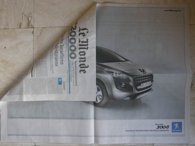 Etonnamment, la double page centrale pouvait donner une idée de la dérive du journal. En effet, une large publicité s’étalant sur 2 pleines pages, vantait les mérites d’un 4x4 français. Tout est là ! En situation de crise économique comme le monde n’en a jamais connu, en période de récession avancée et officiellement annoncée, faire l’apologie d’un tel symbole met en lumière un triple échec : le manque de clairvoyance des fabriquants d’automobiles qui n’ont pas su anticiper la commercialisation de véhicules hybrides ou électriques, le manque de projection d’un journal mal en point, qui dresse le constat d’un passé prestigieux, et la subordination de ce même journal aux puissances publicitaires et industrielles qui font partie de cette crise.