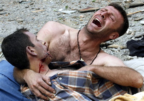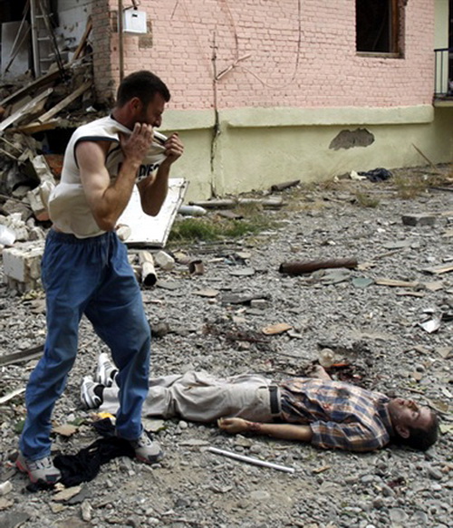Ces deux autres photos du même photographe, montrant un couple âgé pleurant son fils mort sont d’évidence des mises en scène du photographe, dont l’objectif était évident : gagner des prix en réalisant LA photo de la guerre d’Ossétie du Sud d’août 2008. De toute évidence, le corps a été déplacé pour les besoins du cadrage et la femme a reçu des instructions pour adopter des poses photogéniques.