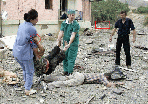 Cette photo a d’abord été publiée par Reuters avec la légende "une femme morte est emmenée dans la ville de Gori". mais curieusement, cette "femme morte" s’accroche au bras de l’infirmière !