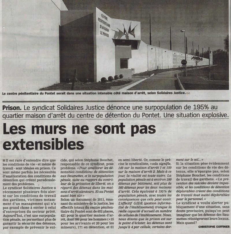Publie le mercredi 30 janvier 2013 par stef84 - Open-PublishingSOLIDAIRES-JUSTICE DENONCE UNE SURPOPULATION PENALE DE 195 % SUR LES DEUX MAISONS D’ARRETS DU CP LE PONTET...