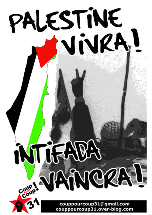 Le collectif "Coup Pour Coup 31" ( http://couppourcoup31.over-blog.com ) lance une campagne de solidarité au peuple palestinien. Ce tract sera diffusé dans les différents rassemblements toulousains et dans différents quartiers populaires de Toulouse.