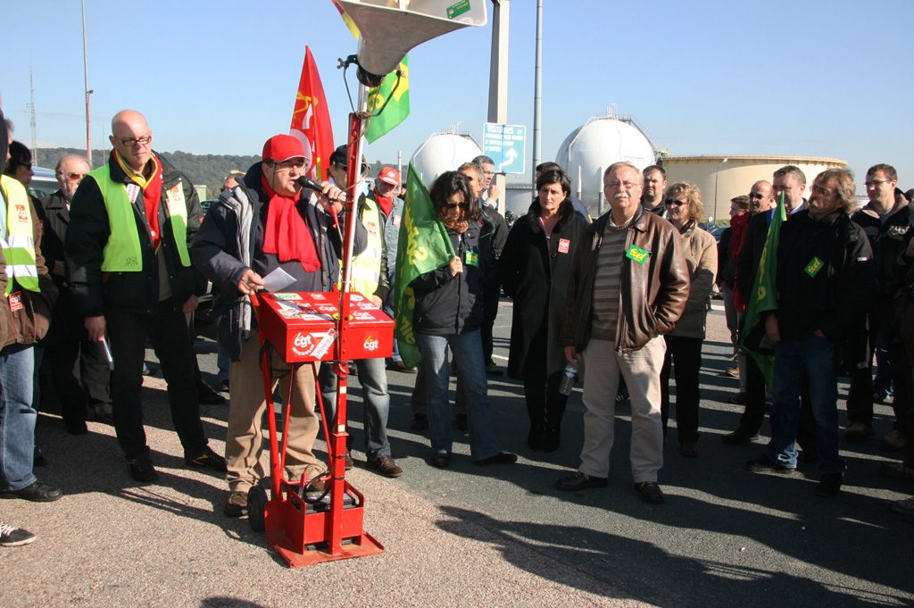 Vers midi, le barrage a été levé pour rejoindre la raffinerie de Normandie-Total où se tenait une assemblée générale interprofessionnelle. « Le gouvernement déclare la guerre aux salariés, tonne un syndicaliste CGT. Le code de défense nationale n’est mis en place qu’en cas de conflit armé. Où est la guerre ? C’est le mouvement social qui est visé. On ne peut pas laisser passer. » Même tonalité chez le syndicat SUD Chimie. « Nous vivons un événement extrêmement grave. Du jamais vu depuis la Libération. Sous couvert de réquisition, le pouvoir s’en prend au droit de grève. Ça dépasse la lutte contre la réforme des retraites. Sarkozy brise la Constitution, le droit social, le droit de grève. Cette affaire doit mobiliser l’ensemble du pays d’une manière massive et collective. »