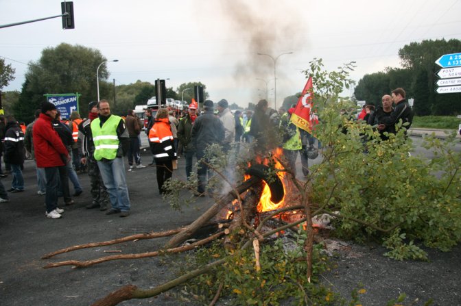 Sur le barrage dressé au carrefour du pont VII bis, l’expérience s’acquiert vite. Des cargaisons de palettes, des litres de café chaud, des caisses de croissants, quelques ballons, une sono transforment vite un carrefour de zone industrielle en zone conviviale autonome. Rock, blues, salsa accompagnaient des centaines de grévistes qui peu à peu construisent des relations solidaires et fraternelles. De temps en temps, la musique s’interrompait pour laisser place aux nouvelles du jour. C’est ainsi que nous suivions en direct les événements de Grandpuits (Seine-et-Marne). Les poings serrés dans les poches.