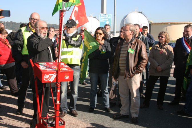 Le secrétaire de l’union locale CGT d’Harfleur en rajoute une couche pour dénoncer les forces de désordre. « Le chef de l’Etat et le préfet sont payés pour faire respecter l’ordre public. A Grandpuits, le président s’assoit sur la Constitution et le préfet organise le désordre. C’est une atteinte aux libertés. » Ce fut ensuite au tour de Marcel Saunier de prendre la parole devant quelques centaines de grévistes de tous horizons venus aux nouvelles. « Je suis entré en 1955. J’avais vingt-deux ans. C’était l’année de la grande grève… qui fut perdue. » Marcel, qui n’est pas un « ancien combattant » mais un combattant, a été de toutes les luttes de la CFR. « Moi l’ancien, moi le vieux, je peux vous dire que je suis très très très fier de vous. » Applaudissements émus.