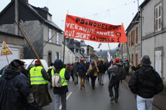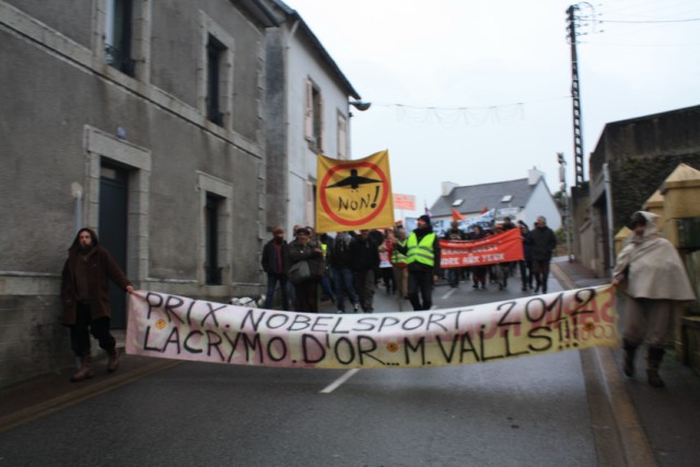 Pour ce week-end d’actions contre VINCI, la coordination du Finistère des Comités de soutien contre l’aéroport de NDDL appelait à une double action. D’abord une manifestation vendredi à 16 h30, dans les rues de PONT DE BUIS, qui permit à environ 200 personnes de défiler joyeusement jusqu’à l’ancienne entrée de l’entreprise NOBELSPORT, entreprise désormais célèbre pour ses engins de répression (flash-balls et grenades assourdissantes) qui firent de nombreux dégats sur la ZAD il y a quelques semaines... Un tract fut distribué,puis le cortège remonta jusqu’à la nouvelle entrée, face au poste de gardiennage.