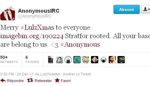 Pas de trève des confiseurs pour les hackers de Anonymous. Le groupe de pirates informatique s’est attaqué dans la nuit du 24 décembre au site du cabinet privé américain de renseignement Stratfor. Les hackers assurent avoir récupéré la liste des clients de ce cabinet qui produit des rapports, analyses et lettres confidentielles payantes sur des sujets liés à la politique, l’économie et le monde militaire.