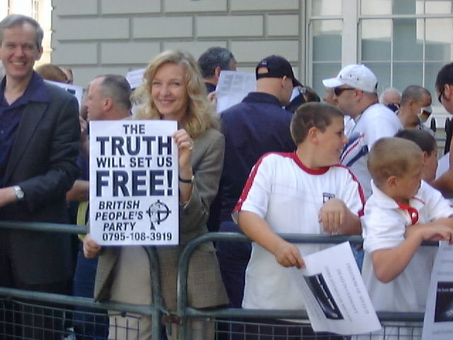 « Lady » Michelle Renouf (puisqu’elle se présente ainsi) est une révisionniste anglo-australienne. Ou plutôt une espèce de porte-parole de la mouvance, voire d’icône. Très proche de l’anglais David Irving [9], elle participa à la conférence de Téhéran en décembre 2006 [10], mais sa principale activité est le soutien aux négationnistes dans leurs démêlés judicaires. En 2007, elle était au côté de son compatriote Peter Rushton lors d’un rassemblement de soutien à Ernst Zündel devant l’ambassade d’Allemagne à Londres [11]. Fin 2008 c’est pour Fredrick Töben [12] qu’elle s’activa. On a pu aussi la voir invitée par le BNP British National Party de Nick Griffin, ou encore au côte de David Duke, un des plus actifs des suprématistes blancs américains. Plus récemment elle produira un film documentaire « Jailing Opinions », film qui fait le point sur les persécutions (n’ayons pas peur des mots) dont ils se disent les victimes, et dans lequel on retrouve en bonne place Robert Faurisson invité de P. Rushton. Distribué via Internet le site du film a pour webmaster le même Peter Rushton, décidément très actif !