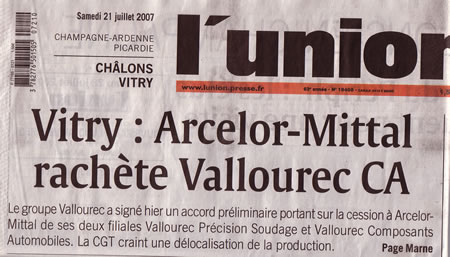 En "Une" du quotidien régional "L’UNION" du samedi 21 juillet 2007 (avec renvoi en page départementale) un gros titre barre presque toute la largeur de la page : "VITRY : ARCELOR-MITTAL RACHETE VALLOUREC C.A."... On savait que VCAV était en vente, avec ses 250 salariés. Les équipementiers automobiles sont dans la tourmente depuis un certain temps et le département de la Marne est particulièrement "sonné", dans ce secteur. Mais le rachat par ce prédateur de la plus haute volée, çà c’est une nouvelle inquiétante au plus haut degré.