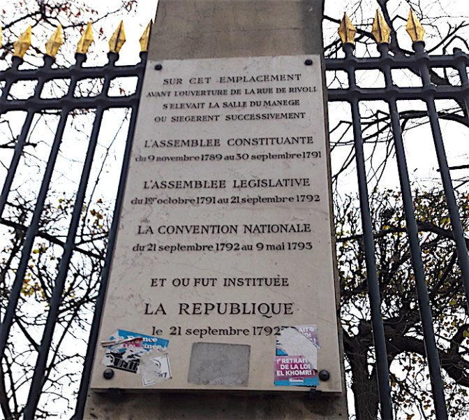 C’est là que siégeait la Convention, dans la salle du manège du palais aujourd’hui disparu. La plaque qui commémore cet évènement est là, au long des grilles du jardin.