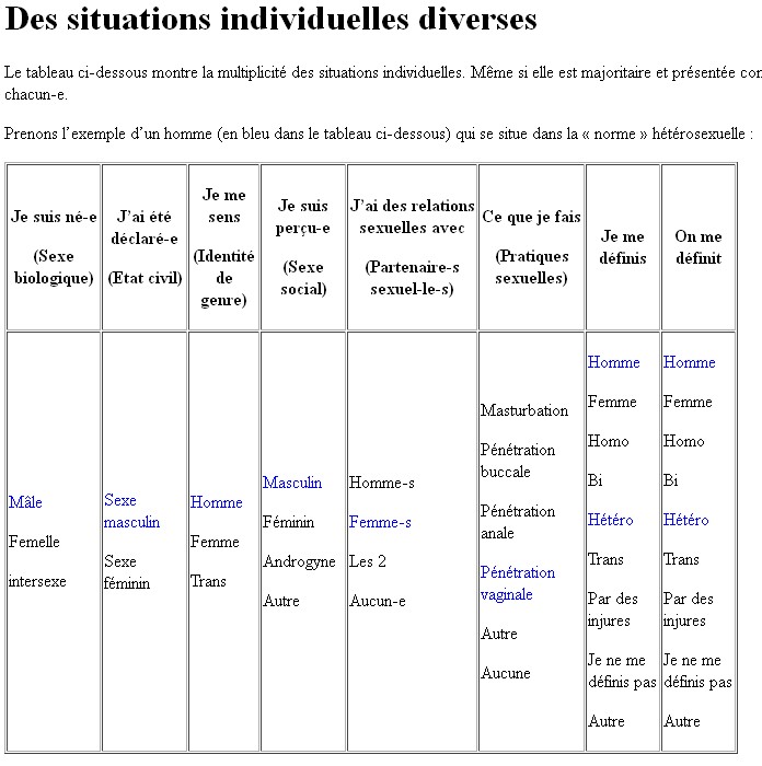 Le tableau décrit par Zemmour figurait bien sur le site (visible en cache ici, le site ayant été victime de hacking depuis lundi, on y reviendra). Contacté par oEy si, le directeur de l’association, Alain Miguet explique que ce tableau n’est pas destiné aux enfants de 11 ans, mais aux lycéens et aux étudiants. Il n’est par ailleurs pas présenté en "une" du site, ou dans une section dédiée aux adolescents, mais dans une rubrique annexe. Contrairement à ce qu’affirme Zemmour, il ne s’agit pas d’un questionnaire, mais d’un moyen de montrer que l’hétérosexualité n’est pas la seule norme. "Le tableau ci-dessous montre la multiplicité des situations individuelles. Même si elle est majoritaire et présentée comme norme, l’hétérosexualité n’est pas la seule voie. Le contexte (lieu, moment, durée, à deux ou à plusieurs…) est aussi un facteur déterminant du vécu de chacun-e", peut-on y lire.