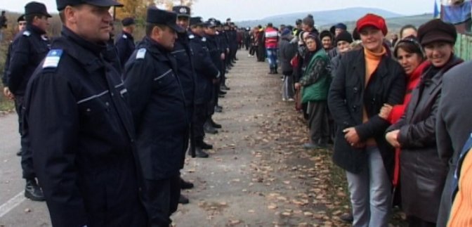 Auparavant, en fin de journée, les policiers anti-émeute ont prétexté sans preuves que les manifestants avaient jeté des pierres sur un de leurs camions pour intervenir brutalement : ils sont arrivé au magasin local où les personnes expulsées du camp s’étaient réunies, et ont emmené et battu violemment certains des dirigeants du mouvement politique et environnemental qui voit le jour en ce moment en Roumanie, arrivés depuis peu. L’appareil photo de l’un d’eux a été cassé. Onze personnes ont été arrêtées. Des dossiers pénaux seront ouverts pour beaucoup d’entre eux, et ils sont condamnés à 29 jours d’incarcération, comme s’il s’agissait de vrais criminels, contrairement à ce qui s’est passé jusqu’à maintenant. Les dirigeants du camp ont clairement été ciblés.
