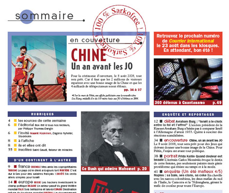 Un coup de tampon orne le dernier sommaire de Courrier International, en haut de la page : "100% Sarkofree !" Slogan répété une deuxième fois le long du cercle, à l’encre rouge, comme sur ces étiquettes qu’on voit dans les supermarchés, type "Label Rouge", ou "Vu à la TV". Le numéro de cette semaine est donc garanti sans Sarkozy.