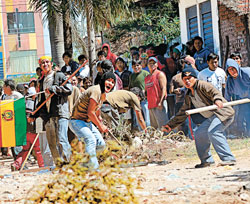 "Je m’acquitte de mon obligation démocratique. C’est une belle journée pour voter", a dit à Página/12 Lorenzo Sanchez, tandis qu’il faisait la queue carte en main. Les opposants au référendum ont sorti plusieurs urnes de l’Institut bolivien Aleman. Ils les ont empilées sur la rotonde et leur ont mis le feu. D’autres manifestants ont avancé vers le collège Thevenet en chantant "Qu’ils le ferment, qu’ils le ferment". Avec des bâtons et des pierres, ils se sont affrontés à d’autres habitants favorables à la consultation. Ils se poursuivaient mutuellement dans les rues du quartier, les figures se perdaient dans la poussière et la fumée des feux d’artifice des deux camps. "Maudite race" a crié un homme quand ils ont mis en fuite les partisans d’Evo. C’est l’appellation préférée des orientaux quand ils veulent offenser les "collas" occidentaux.