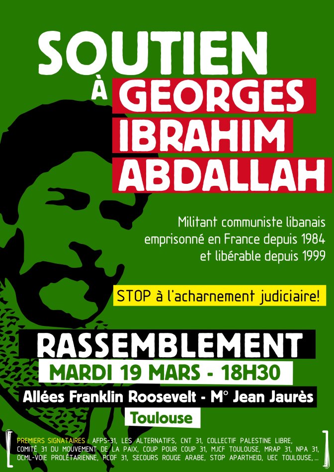 Georges Ibrahim Abdallah, militant communiste libanais, arrêté à Lyon en 1984, a été condamné à la réclusion à perpétuité pour des actions menées par les Fractions armées révolutionnaires libanaises (FARL). Il a combattu, notamment comme membre du Front Populaire de Libération de la Palestine, contre l’occupation israélienne de son pays et de la Palestine.