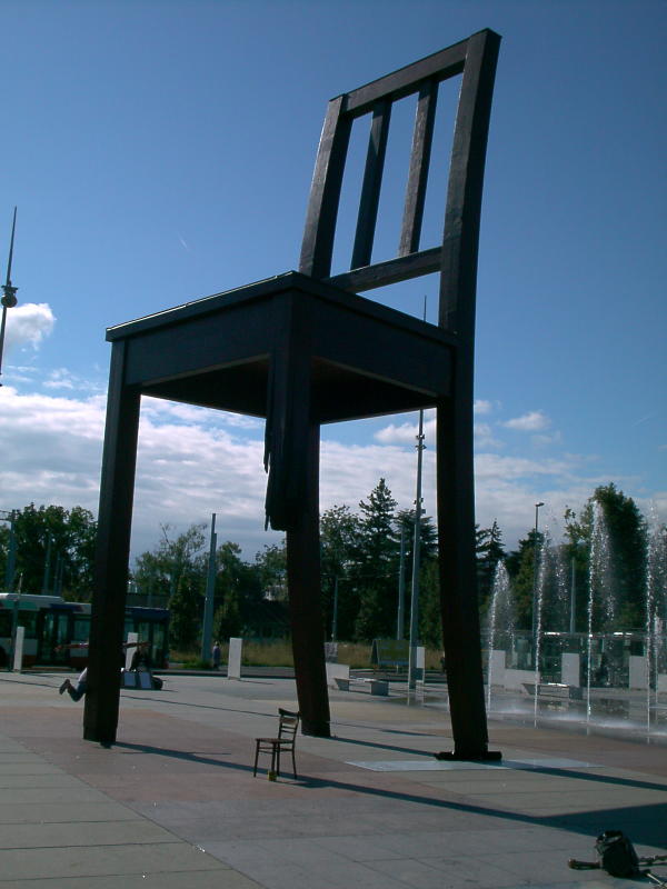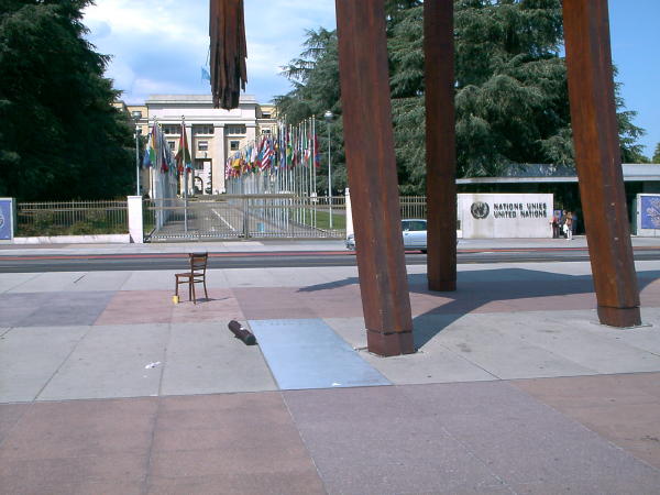 Sur la place des Nations Unies, à Genève, trône une chaise en bois œuvre de l’artiste Daniel Berset sur la commande de Handicap International. Elle ennuie bien l’ONU et a failli disparaître sous prétexte de restauration. Mais la population a veillé à ce que ce symbole reste en place, il reflète bien l’hypocrisie des États composant l’ONU et la barbarie des armes qui frappent aveuglement la population notamment les gosses qui jouent sur la terre bien après les conflits ; « des pièges à enfant ».