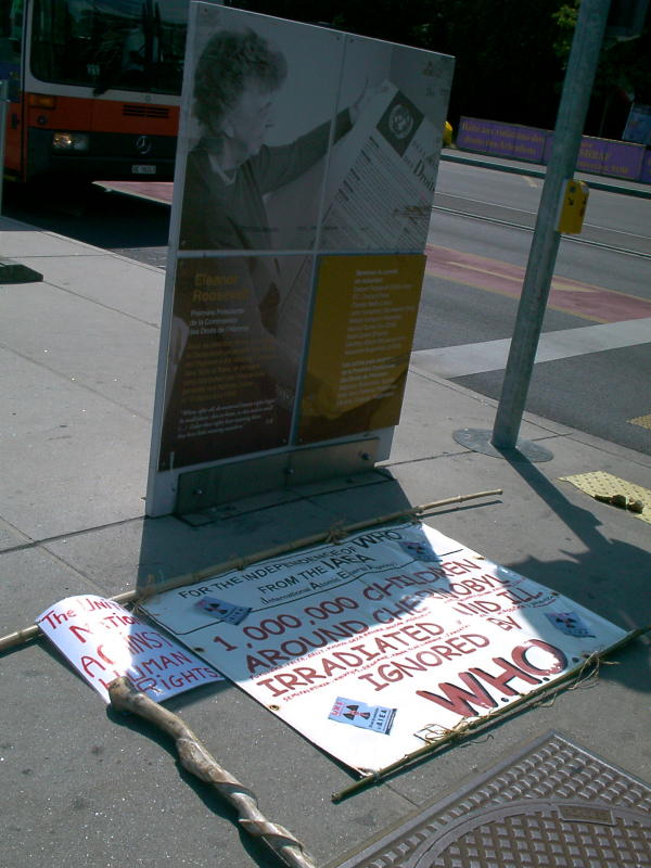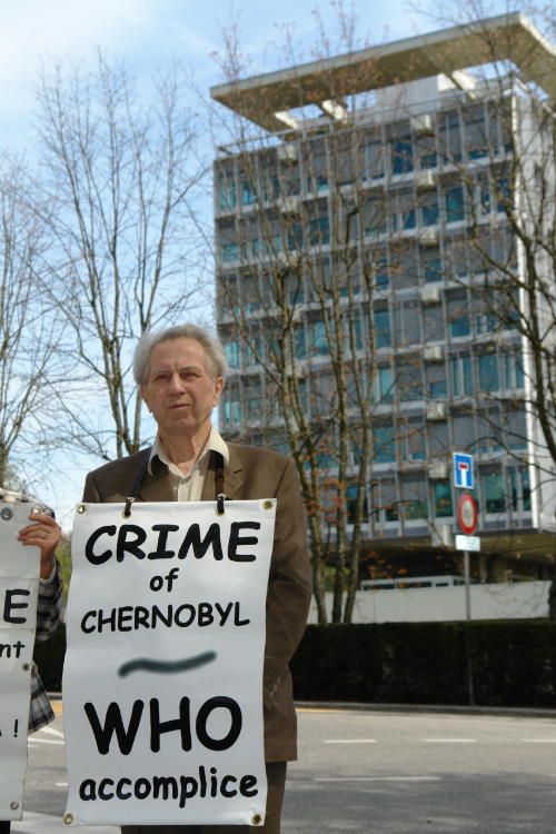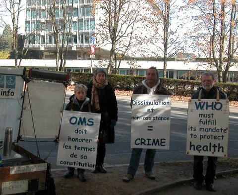 Devant l’OMS, nous allons finir notre 5ème année de « veille des consciences », manifestation silencieuse, dans cette société du spectacle on pourra dire que nous n’avons pas été trop sollicité. Où est le livre des records ? 5 ans de manifestation constante ce n’est pas spectaculaire ? Il a fallu une autre catastrophe pour que des médias s’intéressent à cette imposture (l’accord OMS-AIEA, enfants de Tchernobyl, liquidateurs, rapports forum 1995 et 2005« volatilisés », pas de radioprotection réelle, etc...)