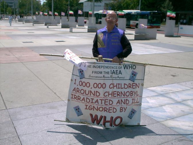 On continue ; on ne peut pas se contenter d’un « on vous l’avait bien dit » et de se faire flatter par la multitude. L’OMS continue elle aussi, de nier, déjà complètement discréditée, elle n’a de toute façon pas la volonté de se donner les moyens d’organiser une véritable radioprotection (pas des mascarades qui ont régulièrement lieu surtout depuis ce qui est arrivé au Japon). Qu’à cela ne tienne, le même petit paysan breton qui a organisé cette folie douce de porter des pancartes de 8h à 18h s’est attelé avec ses collègues d’organiser eux-même un forum annuel sur la radioprotection (même pas peur) et cela sous les fenêtres de l’OMS ! La date est prévue les 11, 12 et 13 Mai 2012 juste avant l’assemblée générale « mondiale de la santé » annuelle de l’OMS, qui réuni tous les pays membres avec tous ces courageux haut fonctionnaires qui n’osent pas même lever le petit doigt malgré les sollicitations régulières auprès de leur Mission à Genève depuis 5 ans aussi, ne serait-ce pour demander de réviser l’accord WHA12-40 entre l’OMS et l’AIEA la mafia atomique. Peut-être que ces haut- fonctionnaires se sentent bien faibles vis à vis des donateurs privés comme Bill Gates (et autres mafias du vaccin et des semences brevetés) qui donnent largement plus à l’OMS que les États des pays membres. États de toute façon déjà privatisés, il est vrai.