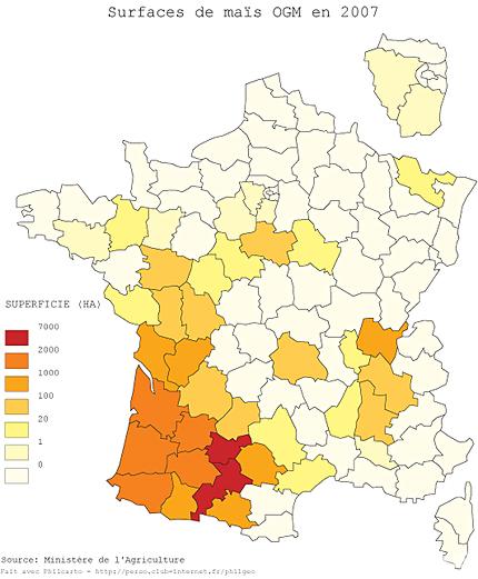 La quasi totalité du maïs OGM est cultivée dans le Sud Ouest, en région Aquitaine et Midi-Pyrénées. Les départements de Haute-Garonne et du Tarn-et-Garonne sont les plus touchés. Ils cultivent chacun plus de 2000 hectares de maïs OGM, ce qui provoquera inévitablement des contaminations des cultures voisines et portera un préjudice certain aux productions de qualité sous label et à l’agriculture biologique.