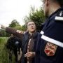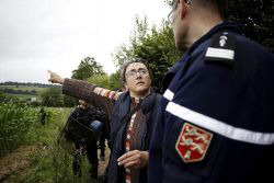 La femme de Yves Larsonneur discute avec un gendarme après l’arrestation de son mari, le 31 juillet 2012 au Chefresne