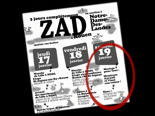 Ce rassemblement, organisé en contrechamps de la manifestion pour "le mariage pour tous", a été l’occasion de réaffirmer l’opposition des rouennais à la construction de l’aéroport sur la commune de Notre Dame des Landes ou ailleurs.