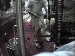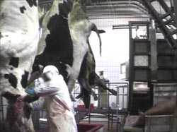 Pour l’abattage standard, les bovins sont étourdis puis suspendus à la chaîne d’abattage, mais au lieu d’être immédiatement égorgés comme l’exige la réglementation (1), l’employé chargé des mises à mort accumule du retard ce qui entraîne une reprise de conscience des animaux avant leur égorgement.
