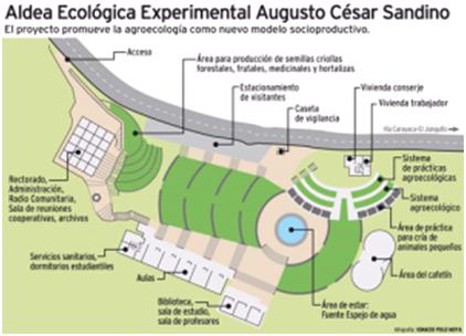 Ce Village Agro-écologique Expérimental Augusto César Sandino comptera des espaces d’activités pratiques et théoriques parmi lesquelles 10 salles de classe pour 30 étudiants, équipées avec des ressources didactiques, une salle consacrée á la planification agro-écologique, trois laboratoires : l’un de détection des maladies végétales, l’autre pour la production d’engrais agro-écologiques et le troisième pour l’étude et la conservation des semences autochtones. Il y aura aussi des parcelles pour les cultures tropicales et un système de production d’espéces forestiéres autochtones, dans le cadre de la récupération des sources d’eau pure dans des zones protégées.