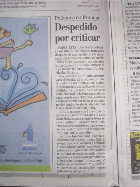 Voilà un article issu d’un journal argentin (nacio) du 20 juillet à propos de l’affaire Val-Siné.