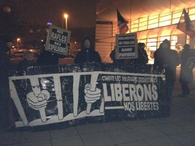 Malgré un froid sibérien, près de 80 militants locaux (RESF, MRAP, TURBULENCES, SUD, CNT, Ras l’Front, collectif de soutien aux Roms, FASE, PG, NPA...) se sont rassemblés pour accueillir comme il se doit le premier flic de France. A son arrivée, pas de tapis rouge mais une haie de colère. De colère contre le racisme d’État, les politiques d’expulsions et sécuritaires, la répression des mouvements sociaux à Notre Dame des landes, à PSA ou ailleurs...