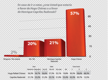 “Si les élections avaient lieu aujourd’hui, voteriez-vous pour Capriles Radonski (21 %) ou pour Hugo Chávez ? (57 %)”. Sans opinion : 20%
