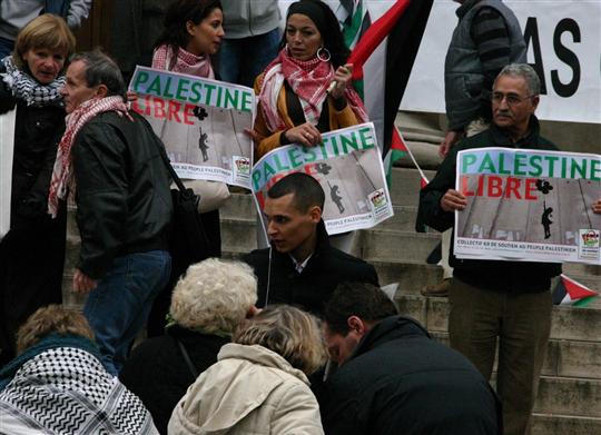 Parmi les militants venus soutenir « l’homme au drapeau » on trouve aussi les militants de l’Union juive française pour la paix. Georges Gumpel tient à préciser qu’il est lui-même fils de déporté, ancien enfant caché, ancienne partie civile au procès de Klauss Barbie : « Je suis 100 % juif et je le soutiens à 100 %. Oui, on peut critiquer Israël, non ce n’est pas de l’antisémitisme ! », assure-t-il, accroché à sa banderole.
