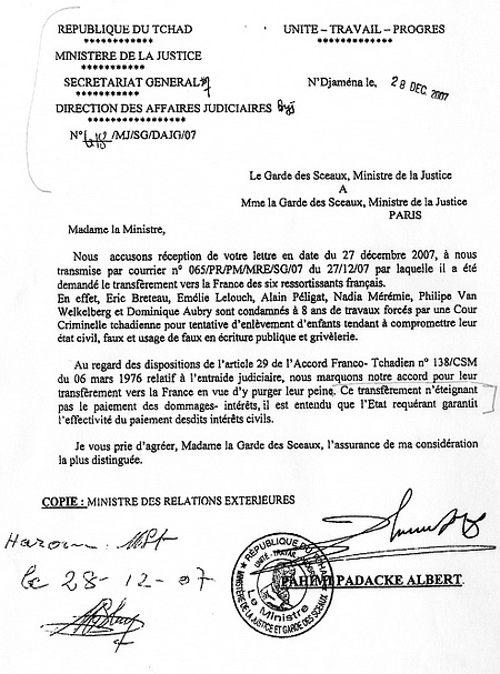 Le 28 décembre 2007, déjà, Albert Pahimi Padacké avait donné son feu vert au transfèrement des six Français vers Paris par une missive parfaitement explicite, que Le Figaro s’est procurée. On y lit notamment : « Au regard des dispositions de l’article 29 de l’accord franco-tchadien (…) du 6 mai 1976 relatif à l’entraide judiciaire, nous marquons notre accord pour leur transfèrement vers la France en vue d’y purger leur peine. Ce transfèrement n’éteignant pas le paiement des dommages-intérêts, il est entendu que l’État requérant garantit l’effectivité du paiement desdits intérêts civils. » Joint mardi par téléphone, le ministre tchadien précise : « Les autorités françaises, qui ont participé au transfèrement sans jamais contester aucun des termes de cette lettre, se sont par là même implicitement engagées à respecter cette obligation. J’attends donc qu’elles mettent tout en œuvre pour que les familles des 103 enfants perçoivent au plus vite cette somme de 4,12 milliards de francs CFA. »