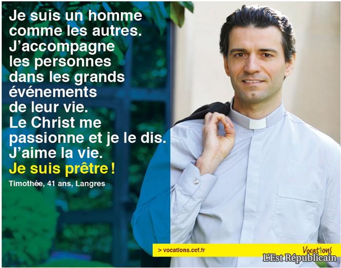Il se prénomme Timothée, a 41 ans et habite Langres. Ce jeune prêtre au col romain porte sa veste sur l’épaule. « Je suis un homme comme les autres » affirme-t-il sur l’encart publicitaire paru dans « Le Figaro » « Le Monde », « La Croix » et « Pèlerin ». Trop beau pour être vrai. C’est un faux. Tout comme Frédéric, 31 ans de Nantes, belle gueuule cheveux au vent et polo col ouvert et Jean, parisien de 52 ans. « Ce sont des pr^petres virtuels. Nous avons voulu protéger les gens et ne pas personnaliser la campagne », confirme le père Eric Poinsot, Franc-Comtois directeur du service national des vocations.