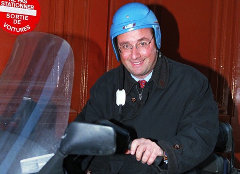 C’est qu’il a l’air goguenard et bonasse le Normal. Avec un casque sur sa tête d’innocent, filant vers ses cinq à sept avec juste deux roues pour carrosse, Mimolette, alias Monsieur Tout-le-Monde, c’est un peu Bourvil qui aurait fait l’ENA. L’image que ses conseillers véhiculent, c’est celle, tranquillisante et illusoire, de la vieille France pataude qui, pataugeant dans son vaudeville, entretient sa République comme un folklore.