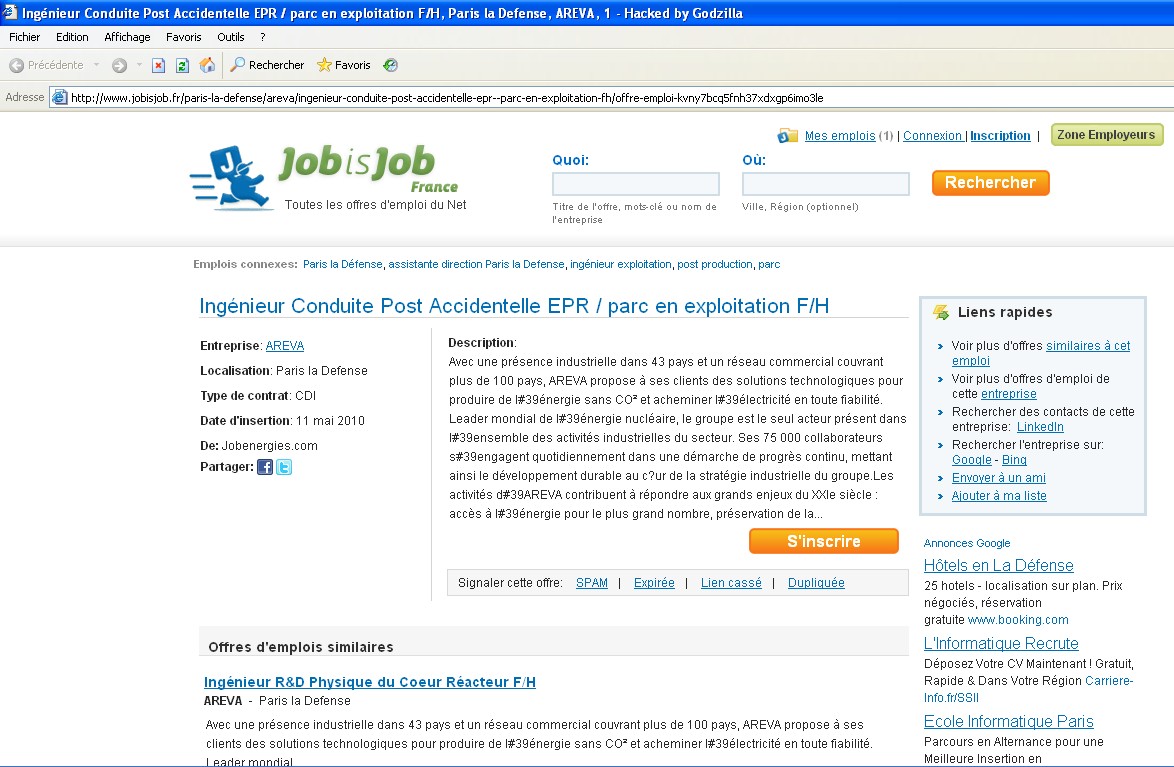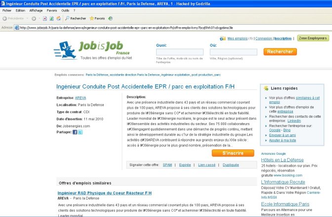 Un job en or dans le nucléaire : ingénieur conduite post accidentelle EPR. Il sont vraiment excellents chez AREVA : le réacteur n’est pas encore construit qu’ils envisagent déja que le truc tourne mal au point de recruter un gars pour le faire tourner alors que ça risque vraiment de lui péter à la gueule. C’est plutôt rassurant tant pour la technique que pour celui qui va assurer la merde... C’est un peu comme si un constructeur d’avion recrutait un pilote d’aéronef en perdition ou un constructeur de camion un pilote d’utilitaire sans frein.