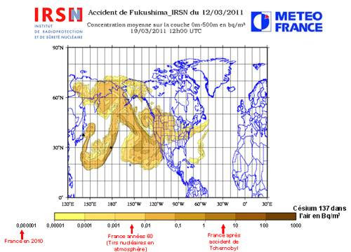 D’après l’IRSN : « le panache radioactif aurait actuellement atteint le nord-est de la Sibérie, les Etats-Unis et l’ouest de l’atlantique. Il devrait atteindre la France à partir du 23 ou 24 mars. Les concentrations attendues à terme, d’après cette modélisation, pourraient être de l’ordre de 0,001 Bq/m3 en France métropolitaine et dans les départements d’outre-mer de l’hémisphère nord. Comme attendu, l’hémisphère sud n’est pas significativement affecté par cette dispersion à grande échelle. A titre de comparaison, les valeurs mesurées au cours des jours suivant l’accident de Tchernobyl dépassaient 100 000 Bq/m3 dans les premiers kilomètres autour de la centrale ; elles étaient de l’ordre de 100 à 1000 Bq/m3 dans les pays les plus touchés par le panache radioactif (Ukraine, Biélorussie) ; en France, les valeurs mesurées dans l’Est étaient de l’ordre de 1 à 10 Bq/m3 (le 1er mai 1986). » Sur ce site, on peut trouver les mesures en temps réel de la radioactivité sur les balises en France.